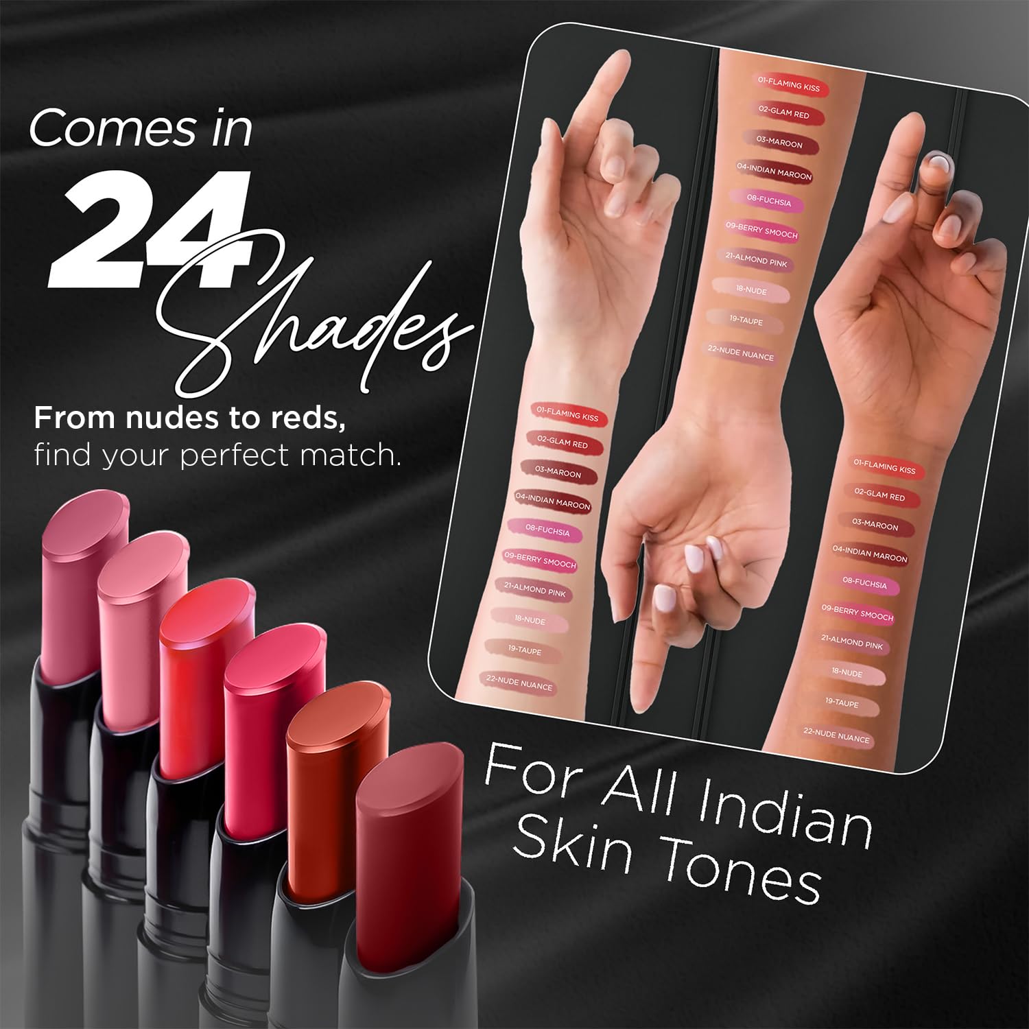 - Soft Matte, High Pigment Finish: One smooth swipe gives bold, rich colour with a velvety matte look that flatters Indian skin tones. Feels light and breathable, never heavy or chalky.