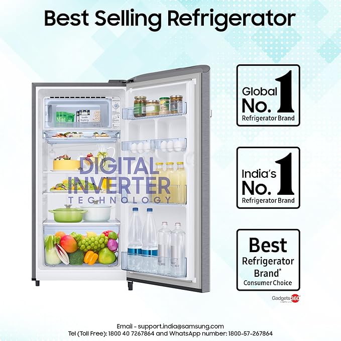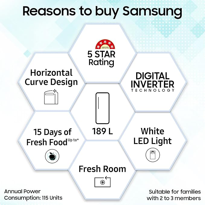 • Samsung Exclusive Features : Fresh Room | Horizontal Curve Door Design | Stabilizer Free Operation (100v – 300v) | Smart Connect Inverter (Automatic) | Up to 15 days of fresh food | Lock & Key