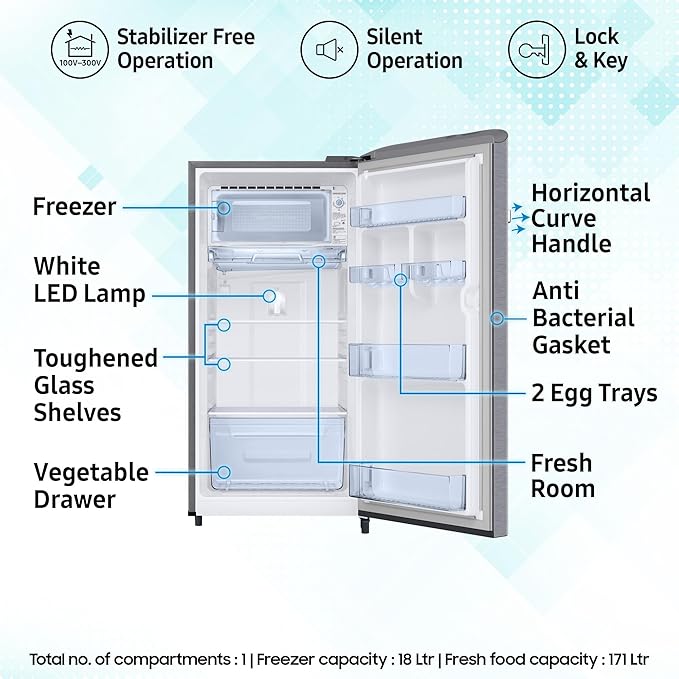 • Interior Description : Fresh Food Capacity : 171 ltr | Freezer Capacity : 18 ltr | Total no. of Compartments : 1 | Shelves : 2 | Vegetable Drawers : 1 | Shelf Type : Toughened Glass Shelves | Anti Bacterial Gasket
